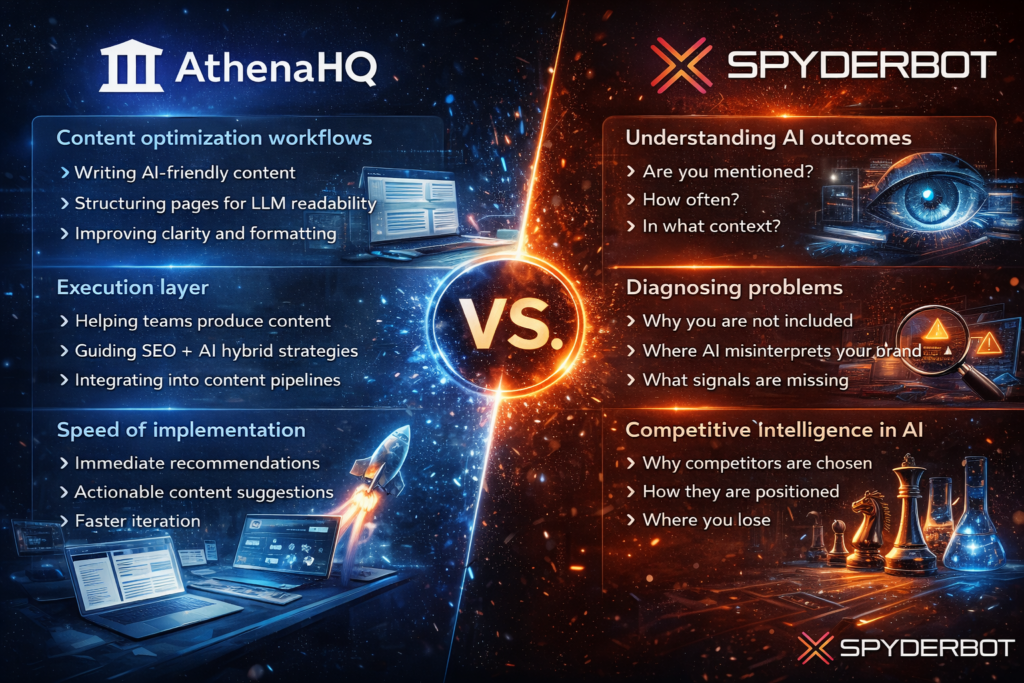Tags: AI brand mention tracking, AI brand monitoring, AI content optimization tools, AI content optimization vs GEO analytics, AI search analytics tool, AI search competitor monitoring, AI visibility tracking, AthenaHQ alternatives, AthenaHQ vs SpyderBot, generative engine optimization tools, GEO analytics platform, LLM visibility tracking tool, SpyderBot vs AthenaHQ