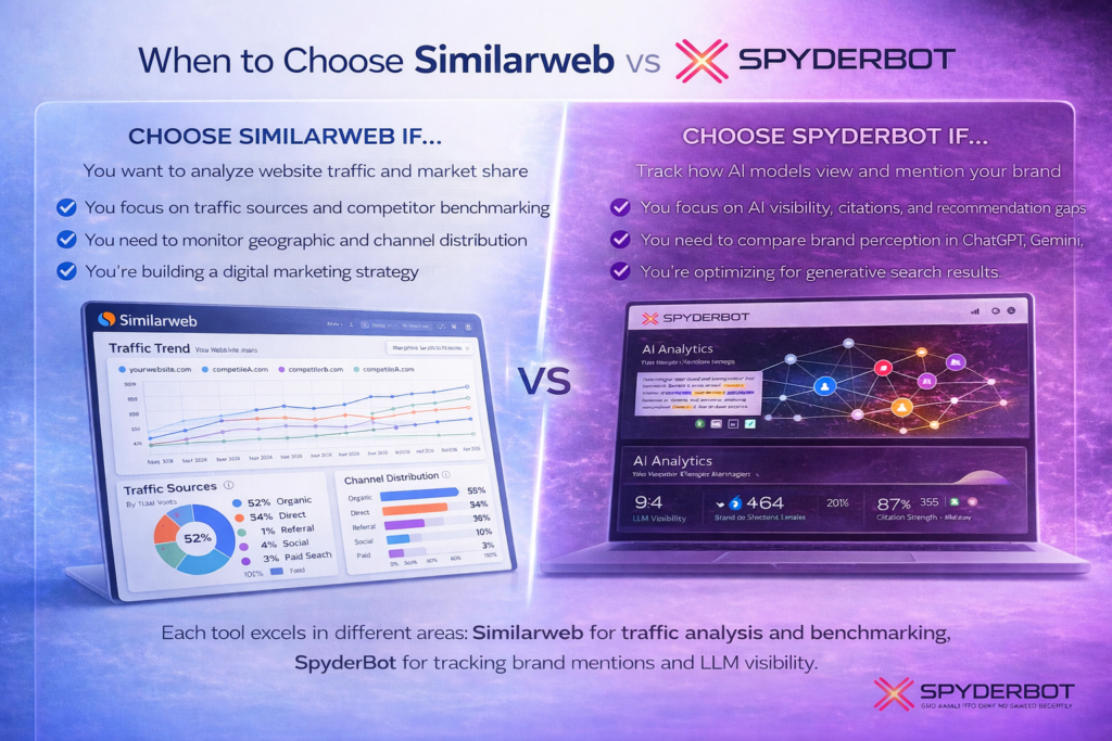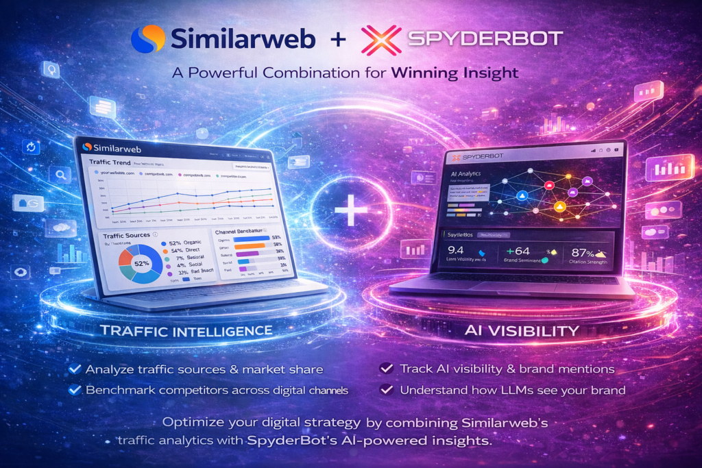 Tags: AI brand mention tracking, AI brand monitoring, AI search analytics tool, AI search competitor monitoring, AI visibility tracking, digital intelligence vs AI visibility, generative engine optimization tool, GEO vs traffic analytics, LLM visibility tracking tool, SEO vs AI search optimization, Similarweb alternatives, Similarweb vs AI tools, SpyderBot vs Similarweb, traffic analytics vs AI analytics