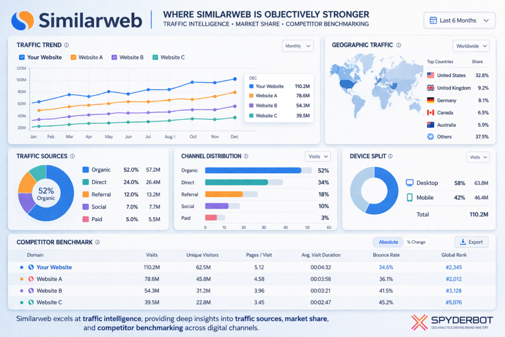 Similarweb is strongest when teams need traffic intelligence, channel breakdowns, competitor benchmarking, and market-level trend analysis
