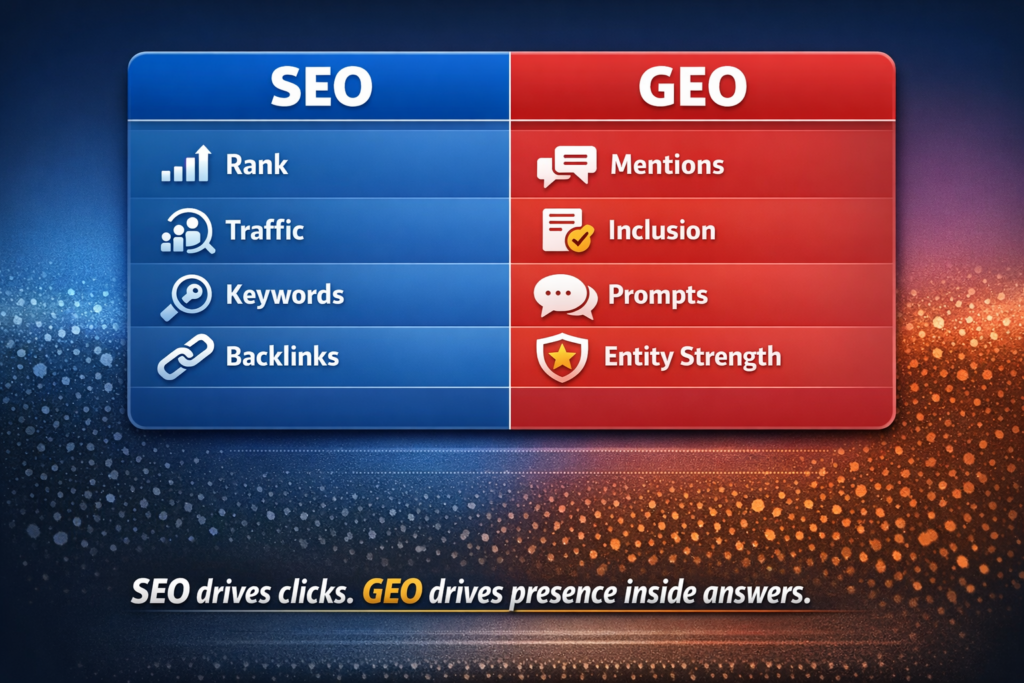 Unlike traditional SEO, which optimizes for rankings in search engine results pages (SERPs), GEO focuses on optimizing inclusion, citation frequency, sentiment, and competitive positioning inside AI-generated answers.